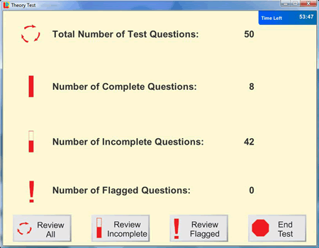 • Unlimited randomly generated Theory Test simulations (again properly balanced with the right number of questions from each category) just as on the real test.